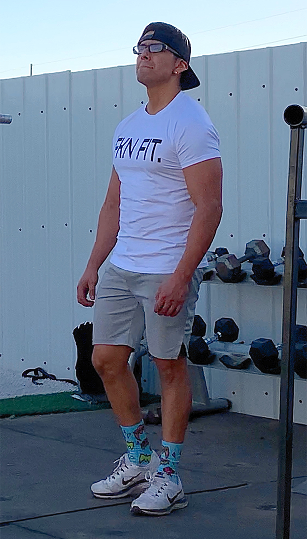 Model is 5'7", wearing size Large with a 31" waist, and a 42" chest.