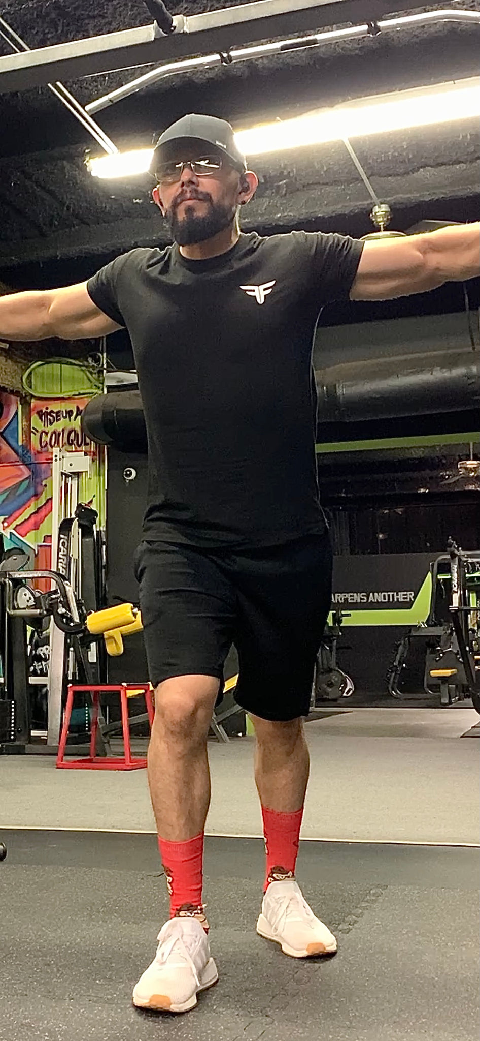 Model is 5'7", wearing size Medium with a 31" waist, and a 42" chest.